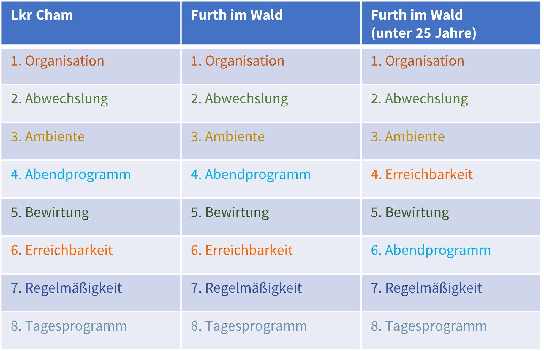 Organisation, Abwechslung und Ambiente sind den Leuten besonders wichtig. Schlusslichter sind die Regelmäßigkeit und ein Tagesprogramm. Bemerkenswert ist die höhere Bewertung der Erreichbarkeit bei den jungen Further*innen.