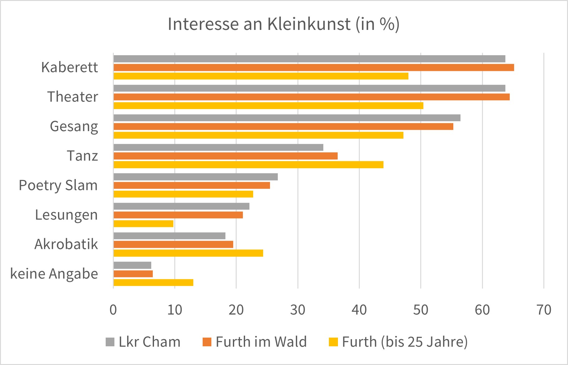 Das Interesse an Kleinkunstveranstaltungen ist breit gefächert, jedoch positionieren sich Kabarett und Theater an der Spitze, gefolgt von Gesang und Tanz. Auch hier fallen keine Angebote all zu sehr zurück.