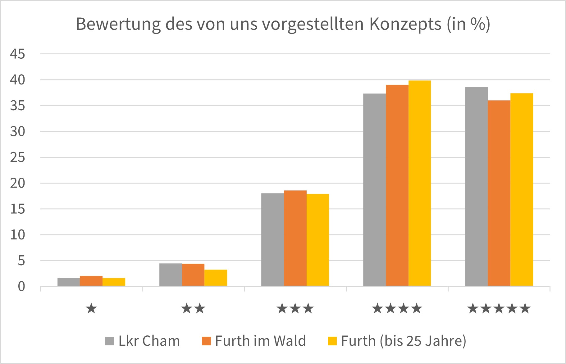 Die Bewertung unseres Konzepts zeigt, dass wir einen Nerv der Bevölkerung treffen. 3/4 der Personen haben entweder 4 oder 5 Sterne vergeben. Im Mittel wurde unser Vorschlag mit 4,1 von 5 Sternen bewertet.